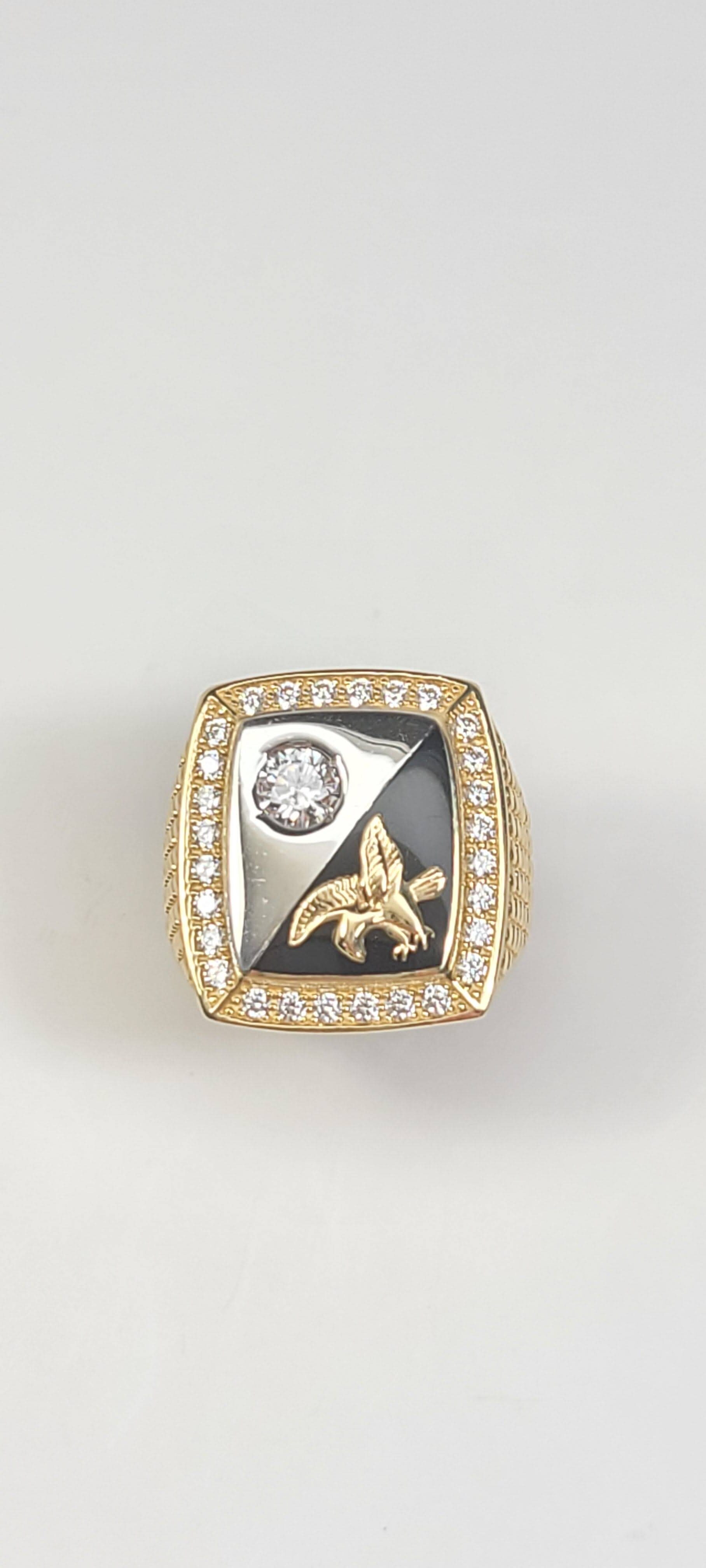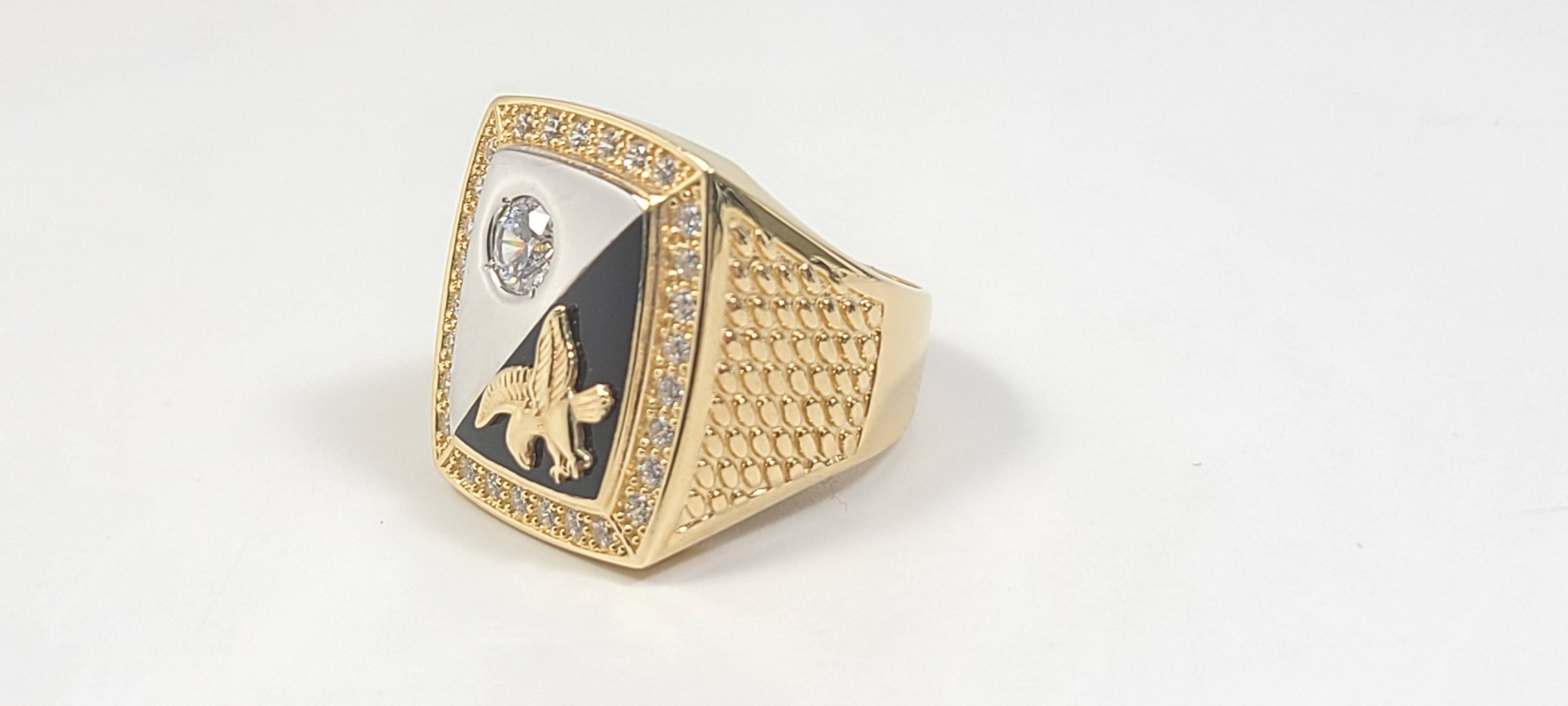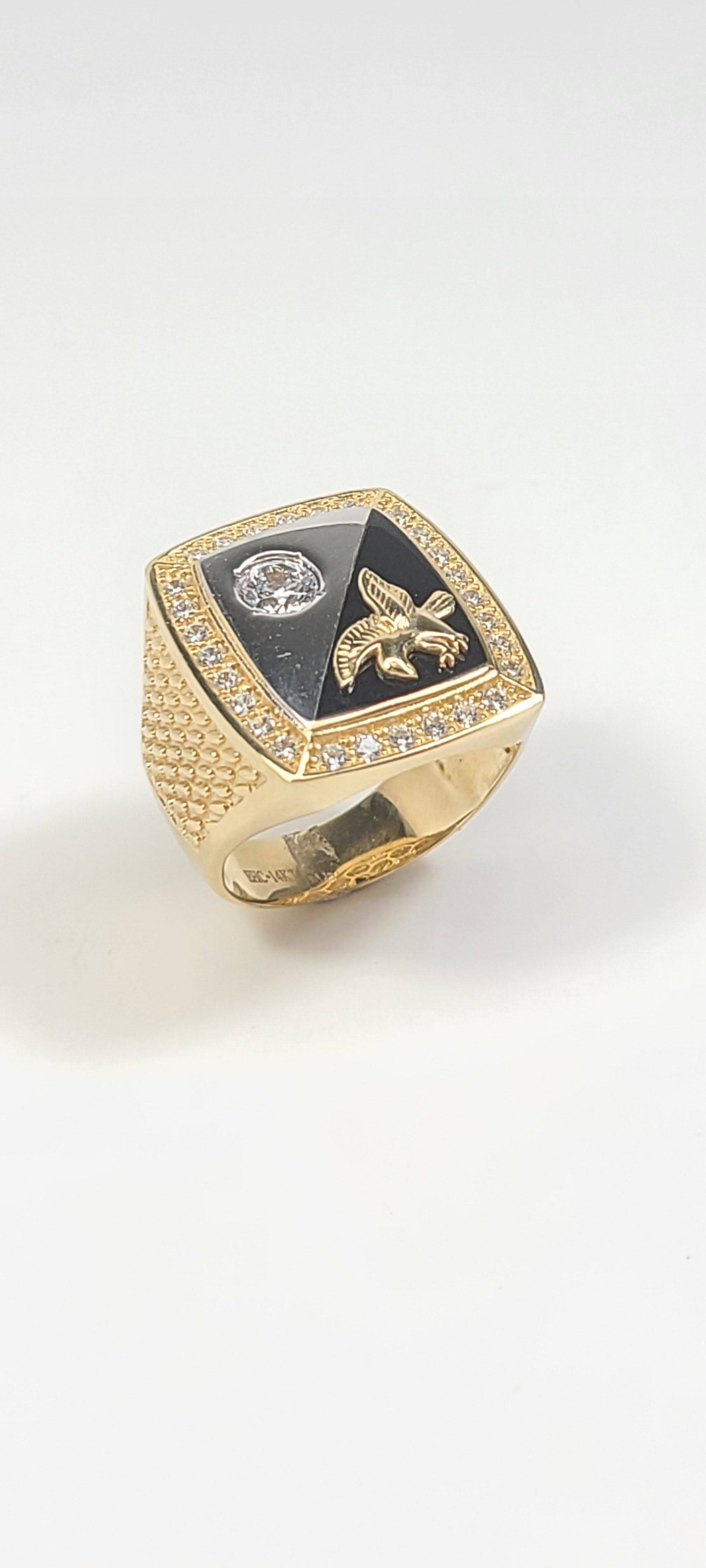 This ring has two distinctive designs: a clear zirconia mounted on 14KT white gold and a raised eagle in flight on black stone. Crafted in 14KT gold. Grams: 3.05; Re-sizable if needed.
