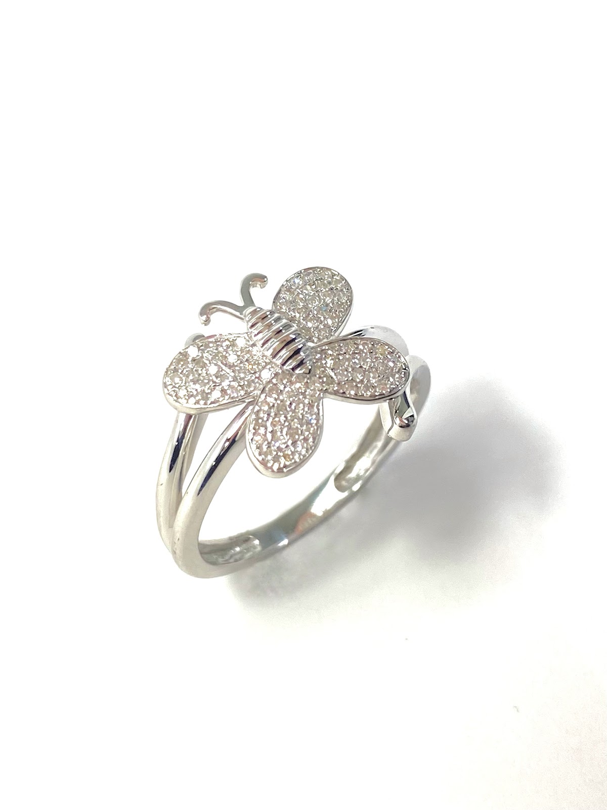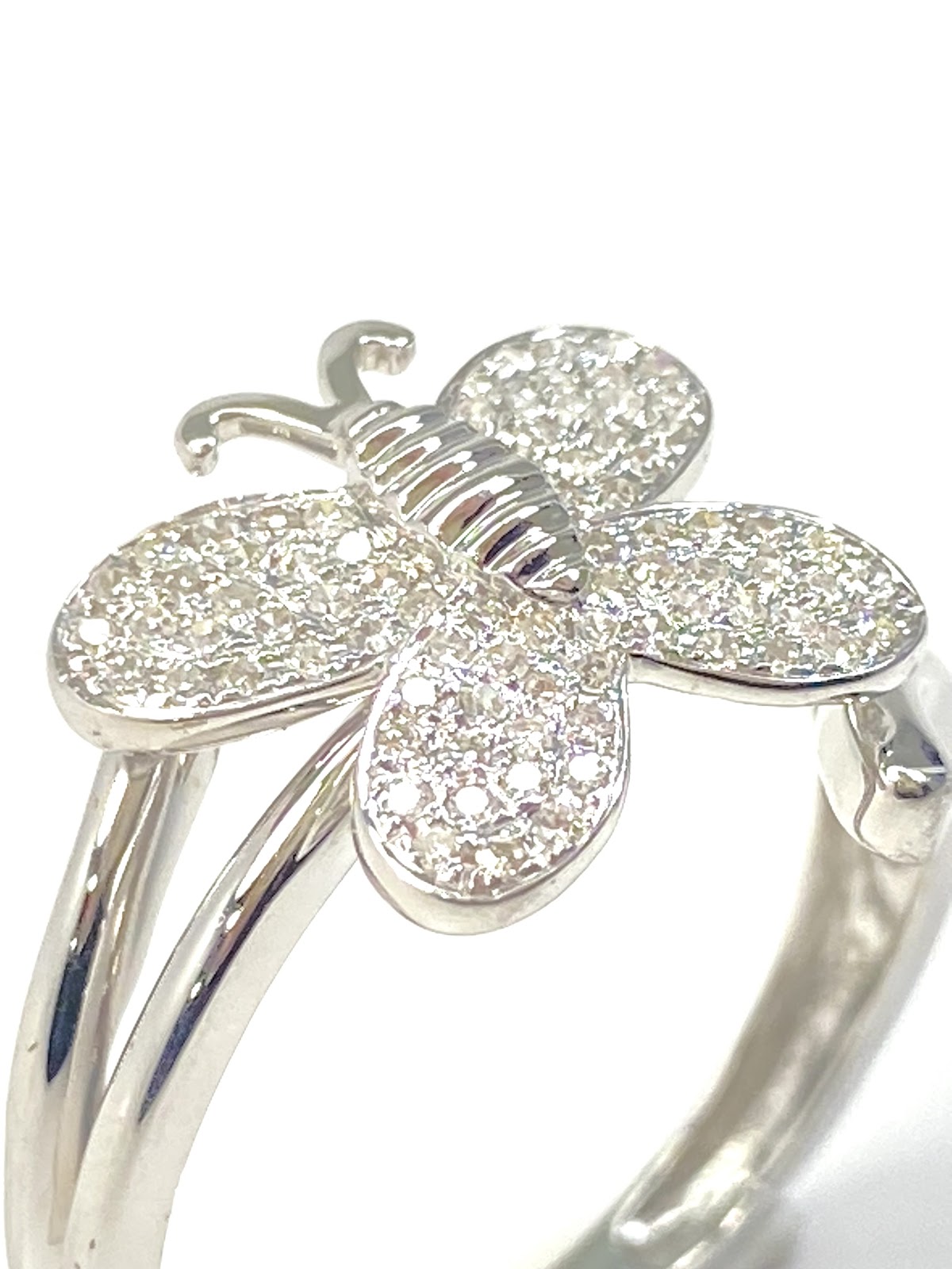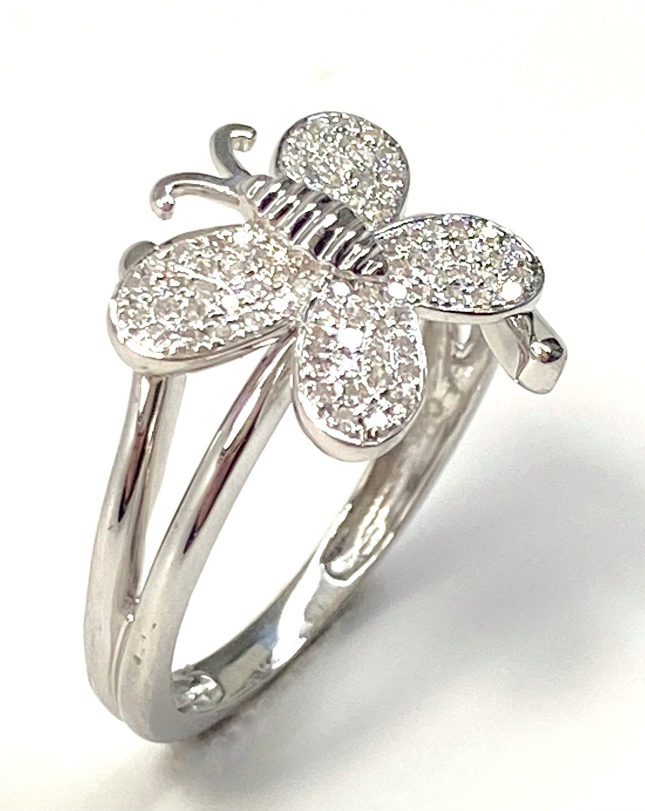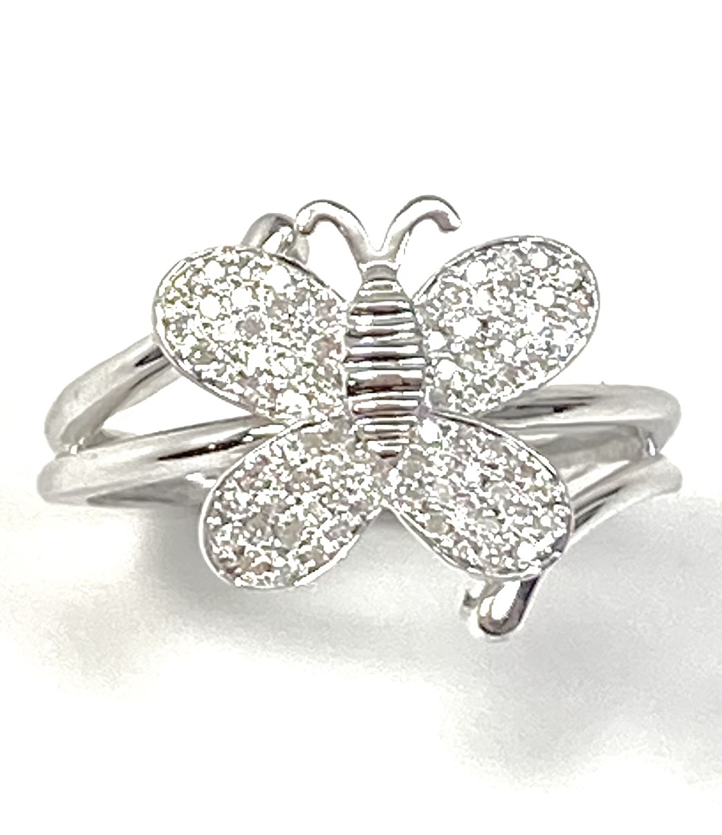 This butterfly ring creates a lifelike volume and set with gleaming diamonds. Set upon a delicate white gold split band, this delicate jewel is petite enough to wear every day. April birthstone. Genuine Diamonds: .25CT; Re-sizable.